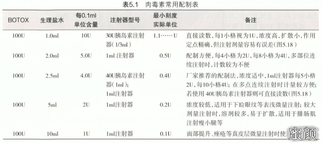 肉毒素有多种配制方式(表5.1),使用传统1ml注射器(图5.16)进行注射时,以往多直接将100U的肉毒素配成2ml或4ml注射液,这种方式在配制时较方便,但不方便计算使用量。