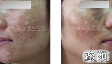 患者内眼角有蓝黑色皮肤斑点,考虑到是太田痣,面部不对称黄褐斑,下颌骨有痤疮样皮疹。治疗应该针对这三种诊断。但当第三次常规治疗时,不仅没有明显的效果,患者还报告偶尔会出现皮肤发红、发痒的情况。在与同事分析并复查病史后,偶然发现病人有一段故事。