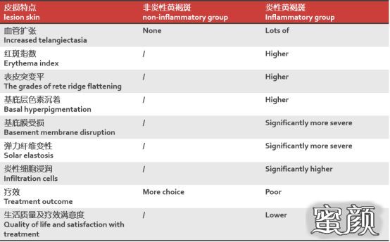 炎性黄褐斑基底膜损伤及色素沉着较严重,炎症细胞浸润明显,血管扩张及红斑指数较高。
