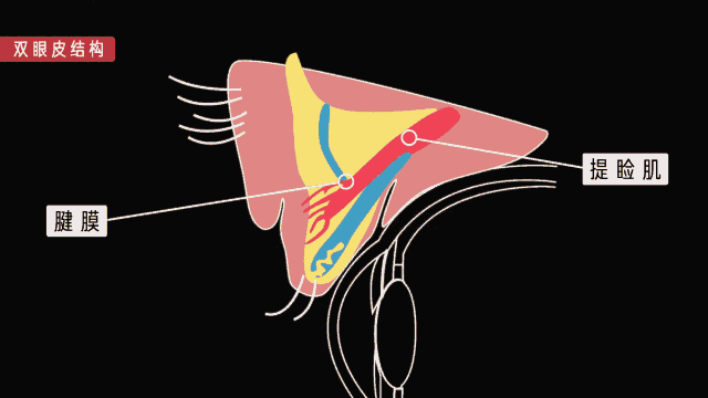 在双眼皮中,由于提上睑肌的腱膜穿过厚重的组织并直接粘附在皮肤上,当提上睑肌收缩时,它会将相应位置的皮肤向内拉,形成一个褶皱,即双眼皮。
