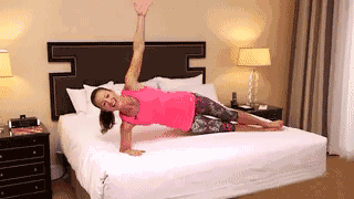 直躺在床上,右手曲肘垂直于床面并支撑上身,左手于身体一侧抬高垂直于天花板。双腿并拢伸直,右腿撑于床面,左腿绷直向上抬高。注意,要保持身体平稳。此动作左右各做15-20次。