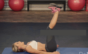平躺在瑜伽垫上,双臂自然垂放于身体两侧,双腿并拢向上伸直抬高,保持上半身挺直,腹部发力,将双腿连带臀部向上抬高,再慢慢放低。此动作反复进行30次。