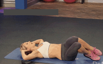 平躺在瑜伽垫上,双手扶在头部两侧,双腿屈膝并拢向右侧压低,踮起使脚尖撑地,保持背部挺直,腹部发力将上半身向上抬高,再慢慢放低。此动作反复进行30次。