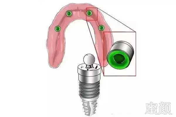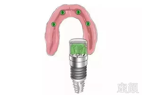 修复基台连接上球帽固位装置——准确的说是“球”,“帽”在总义齿的组织面上。球帽固位装置与种植钉是如此连接的。