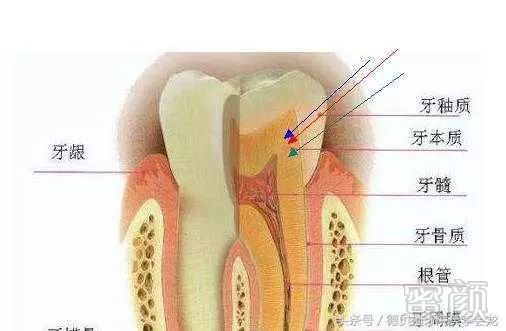 牙齿的组成,是牙釉质、牙本质、牙神经等组成。美容冠磨牙,磨除到了牙本质层(下图三个箭头处),造成的伤害如下:牙釉质丧失,牙本质受损,小管间液不平衡。