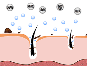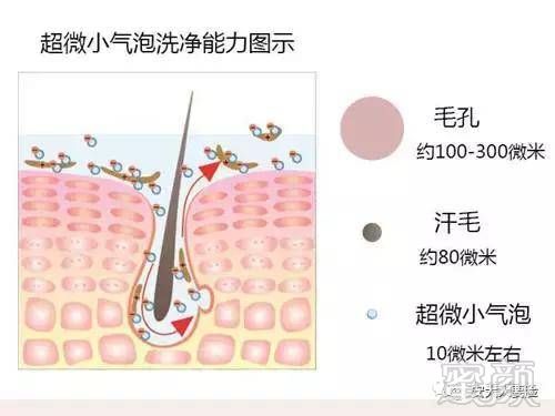 超微小气泡直径只有10微米,可以很容易渗透进入毛孔,然后带走毛孔内的污垢。
