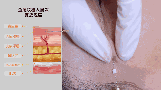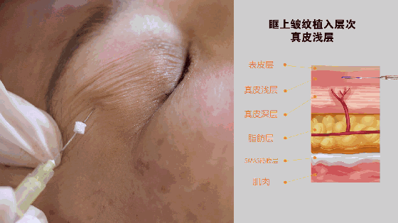 依次将线,植入眶下皱纹部位的真皮浅层: