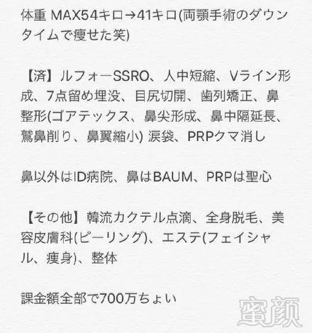 总结整个整容的过程,她主要是进行了正颌、人中缩短、V-line、双眼皮埋线(7点埋线法)、开眼尾、牙齿矫正、鼻综合(Gore-tex垫鼻、鼻尖、鼻中隔延长、削鹰钩鼻、缩鼻翼)泪袋、去黑眼圈的手术。