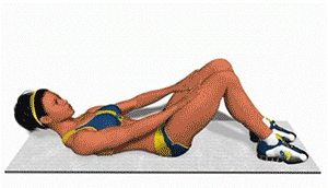 起身动作与仰卧起坐有些相似,现将双腿抬起,与身体呈90度。