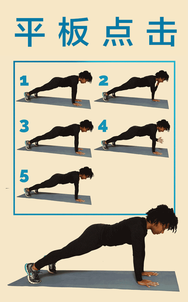 开始时身体呈撑地平板姿势,用右手轻轻拍打左肩,然后左手拍打右肩;