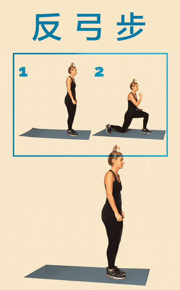 可让后退膝盖轻轻触地,做完一组后,换另一条腿做。