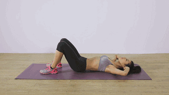 瘦腰第二招:改良版仰卧起坐,双手放置耳后,腰部用力配合臀部提起动作。