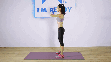 瘦腰第三招:双手举起放置头顶,双腿打开与肩同宽,做向下蹲的动作。