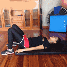 平躺在瑜伽垫上,双臂自然垂放于身体两侧,双脚屈膝并分开,保持背部挺直,腹部发力,将臀部向上抬高,再慢慢放低。