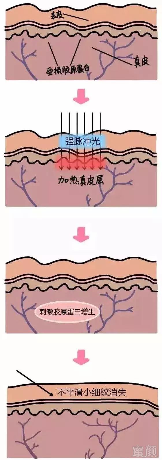 治疗时强光进入真皮层,黑色素吸收其中特定的光线,吸收后产生的高热会导致黑色素分解,同时也会让真皮层的胶原和弹力纤维分子发生变化,恢复弹性,美白的同时也能改善皮肤状态。