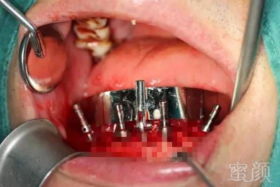 2017年5月26日,医生为何先生拔了那些松动的牙齿,并修整创缘,成固定角度对称植入种植体(那几个关键的钉子)。为了分散咬合力,每颗种植体的角度严格控制,这是“ALL- ON- 4”关键技术所在!