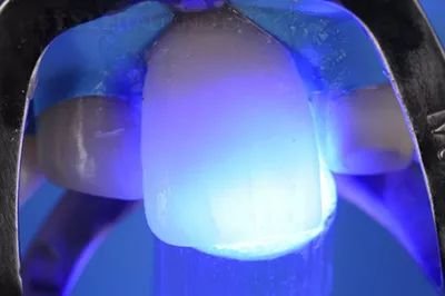 光线能很好地穿透整个贴面,尤其是切牙区域。灯与贴面接触越紧密,材料的转化效果越好。强烈建议延长聚合。