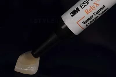 将粘固剂施加在贴面的内表面上。我们建议使用贴面专用粘固剂,这种材料材料稳定性好,一致性好,空隙风险小,结构和表面性能优异。