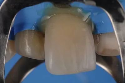 贴面在完全隔离的情况下逐条粘合。在这幅图中,钳子将11号牙齿与其他近端区域隔离开来,并通过其他孔进入近端区域,注意12号牙齿的牙釉质表面是如何不受影响的,而上面提到的中心点需要在切牙处进行调整。所有的近端和颈部边缘都位于牙釉质中。复合材料的堆积物以前是用50微米氧化铝颗粒喷砂处理,以确保旧的复合材料最大的粘合水平。