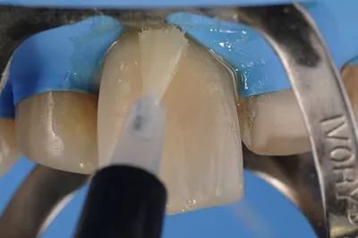 在准备口腔内区域时,蚀刻了长石陶瓷饰面。如果我们用10%的氢氟酸蚀刻1.5分钟,而如果我们使用5%的酸,建议的时间约为3分钟。确保贴面的内部表面看起来均匀,没有碎屑、白斑或有光泽的区域。如果有这些情况,请用磷酸清洁并再次蚀刻。