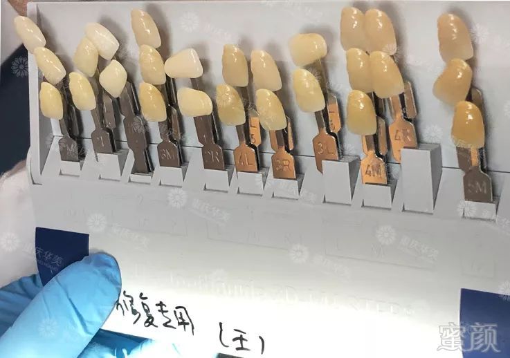 王伟医生结合求美者个人气质和面色,通过32种牙色层次类比,反复配色,选出最佳的颜色,确保色泽逼真。
