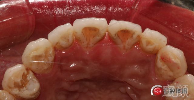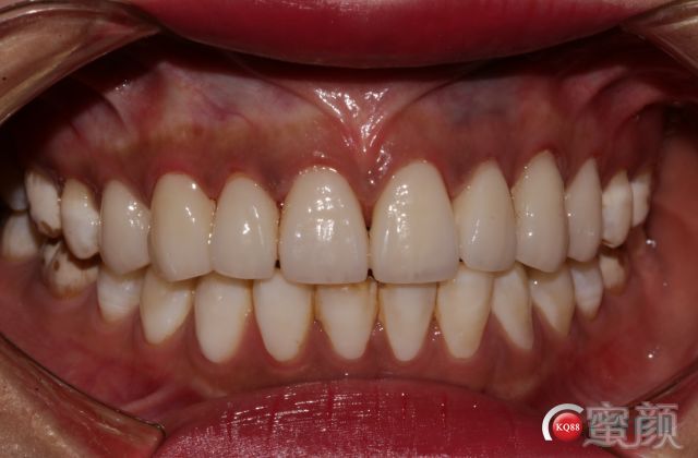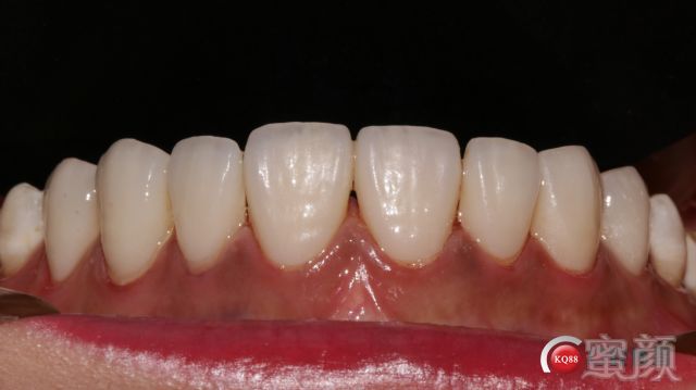下颌我要等技工室的全合架到位了再做;因为涉及到几个合位关系的确定问题;下颌要采用对接式所以侧方合关系要特别注意,不然会出问题。患者很满意;中缝黑三角2周后应该可以恢复;排龈时间压得有点长;两单位对称粘接;邻间隙一定要能过牙线,再往下做;手术刀慢慢刮还是有点费力。效果不错患者满意。