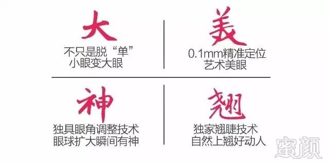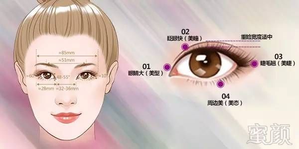 一双成功的美眼案例,绝不只是盲目的追求大眼、重睑宽窄,而是从上睑、下睑以及内外眼角4个方向,根据求美者自身特点,五官比例及气质等12项比例参数,以“两线三弧四美五度美眼”方案量身设计适合的眼部形态。